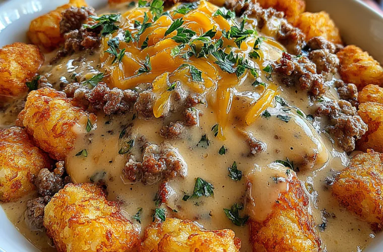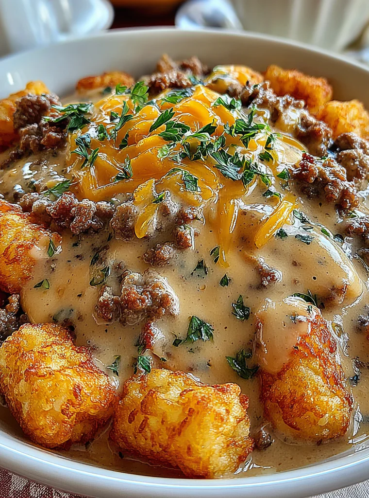 This Tater Tot Breakfast Bowl with Sausage Gravy combines crispy tater tots, rich sausage gravy, and savory flavors, making it an irresistible morning delight.