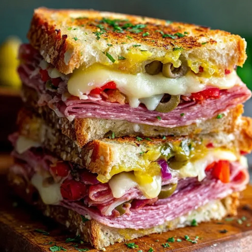 The Muffuletta sandwich is an iconic Italian-American creation that brings together rich meats, bold cheeses, and the unmistakable tang of olive salad layered inside a hearty loaf of bread. Originating in New Orleans, this sandwich is inspired by Italian flavors but has grown into a beloved deli staple worldwide. The layers of mortadella, salami, ham, provolone, mozzarella, and zesty olive spread make it a truly indulgent meal.