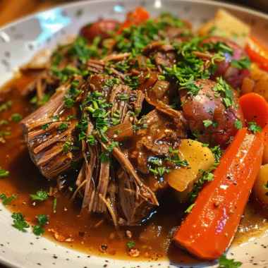 When serving, this pot roast pairs beautifully with creamy mashed potatoes if you want extra starch, or simply serve it as is with crusty bread to sop up the rich gravy. For a unique twist, try serving it over a bed of polenta.