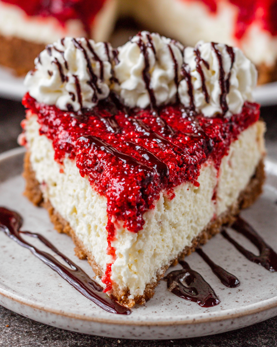 Serving the cheesecake chilled enhances its creamy texture and rich flavor. The whipped cream and extra raspberries add a delightful finishing touch, making your presentation more inviting.