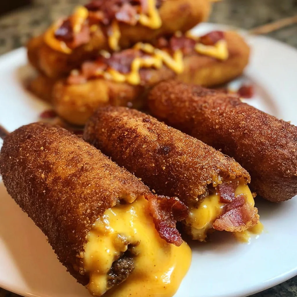 These Deep-Fried Turkey Bacon Cheeseburger Corn Dogs bring together the best of both worlds—classic fair food and indulgent cheeseburgers. With crispy golden batter, a cheesy meaty filling, and the smoky crunch of turkey bacon, every bite is a treat.