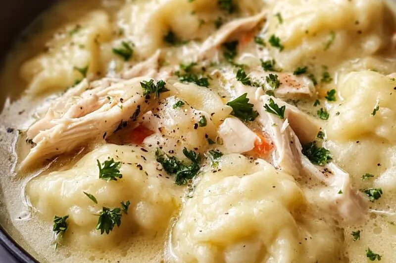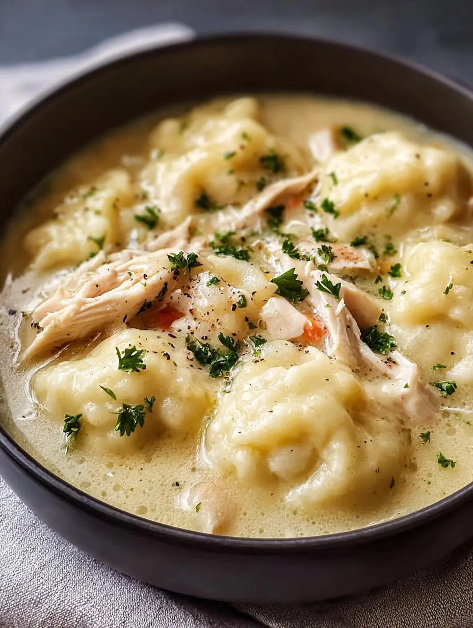 Dumplings are a signature component of this recipe, adding a fluffy texture that complements the creamy broth. They soak up the flavors of the chicken and broth as they cook, providing delightful bites that balance the dish.