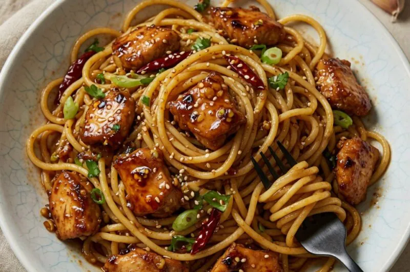 - Combine and Glaze: Return the chicken to the pan. Pour in any remaining marinade (it’s safe since the chicken is cooked). Add the drained noodles. Toss vigorously with tongs. Cook for 2 minutes until the sauce bubbles and thickens into a glossy glaze that coats the noodles.