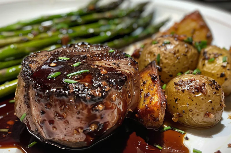 There’s a specific kind of magic that happens when beef tenderloin meets high heat. The exterior transforms — deep mahogany, fragrant with garlic and thyme — while the center stays rose-colored and yielding. Beef tenderloin medallions with garlic herb butter and balsamic glaze deliver exactly that contrast. This is the dish you cook when you want to impress without spending three hours in the kitchen. The tenderloin cut, prized for its buttery texture, needs little more than a generous sear and a finish in the oven. But the real secret? A compound butter that melts into the meat, creating its own sauce, followed by a balsamic reduction that cuts through the richness with sweet-tart intensity.