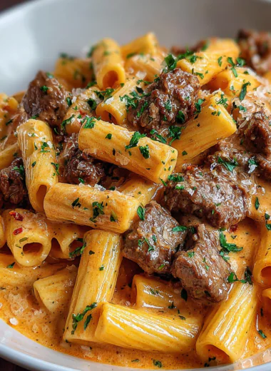 Savor the rich flavors of Beef Pasta in a Creamy Garlic Sauce, featuring tender beef, velvety textures, and a delightful aroma, ideal for cozy gatherings.