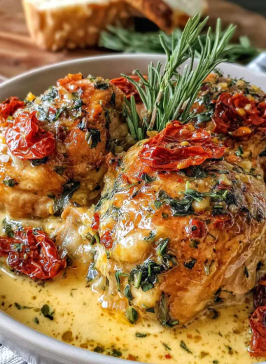 Succulent chicken slow-cooked in a rich, creamy garlic sauce with sun-dried tomatoes and spinach, creating a comforting meal that’s ideal for family gatherings.