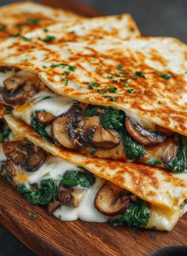 Savor the rich flavors and satisfying textures of Cheesy Spinach and Mushroom Quesadillas, ideal for casual gatherings or a cozy family dinner.