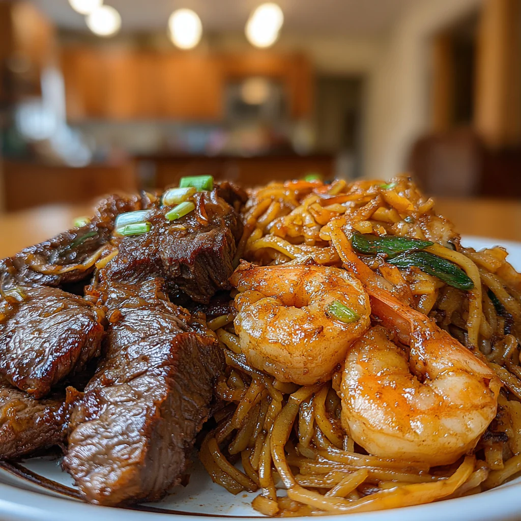 The harmony of the ingredients and the rich sauces transform simple stir-frying into an art. As the noodles soak up the savory goodness from the steak and shrimp, each bite delivers a delightful taste experience. Whether it's for a special occasion or simply to please your tastebuds, this recipe is sure to impress.
